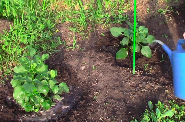 - Forbered brønnene. Dybden og bredden skal tilsvare størrelsen på plantens rotsystem. Avstanden mellom sporene må være minst 40 cm.