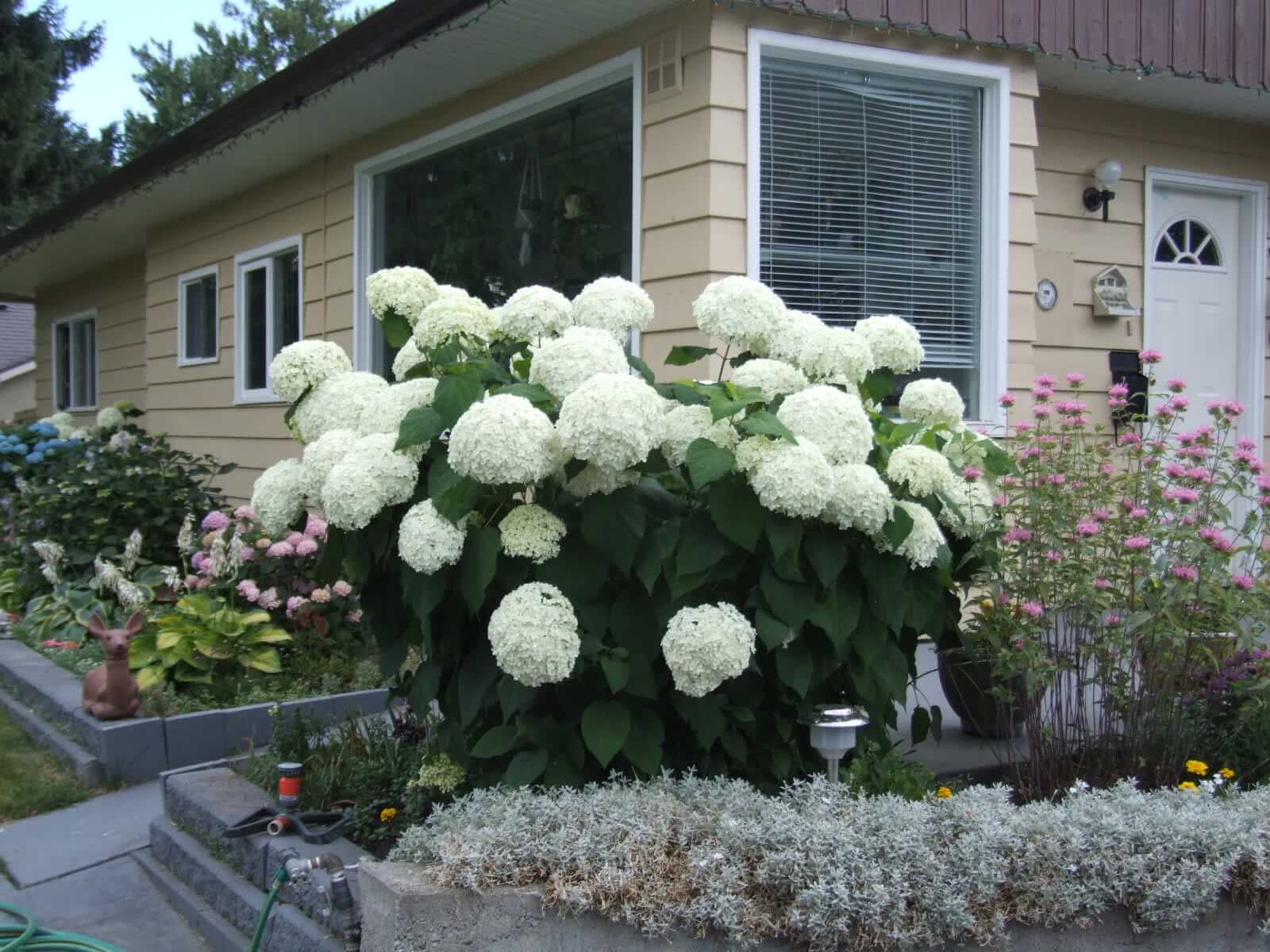 - hortensia Annabelle har store hvite blomsterstander. Den begynner å blomstre midt på sommeren (slutten av juni - begynnelsen av juli) og slutter tidlig på høsten. Høyde er 120-150 cm, bredde - opp til 350 cm. Det tåler lett temperaturer ned til −28 ° C, men i Sentral-Sibir og dets vestlige regioner er det bedre å plante en plante i en gryte for overvintring i kjelleren;