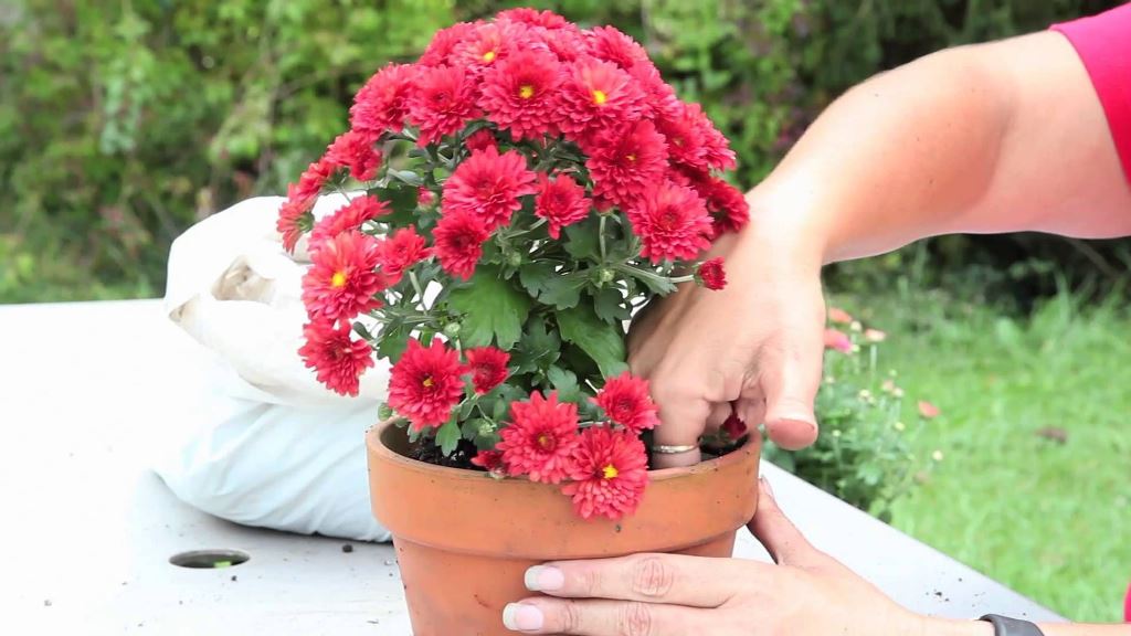 Transplantasjon av et blomstrende krysantemum må utsettes til blomstringen er fullført.