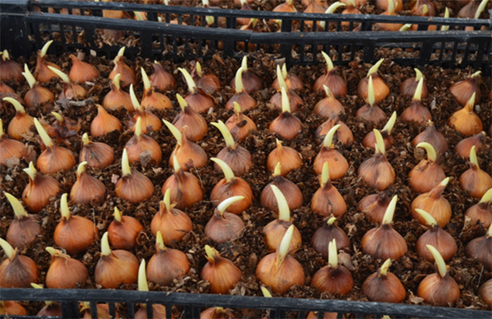 Hvis det er behov for å plante pærene om våren, må du simulere et kaldt trykk, så i år vil du kunne nyte blomstene som har dukket opp. For dette plasseres pærene i en beholder eller i en gryte på balkongen eller i kjøleskapet. Du trenger bare å sørge for at skuddene rettes oppover. Frøplanter plantes i bakken allerede i april eller mai.