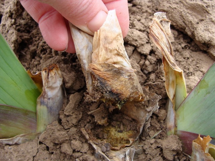 - Bakteriell råte. Årsakene til denne sykdommen dvale i jorda eller på planterester. Bakteriell råte vises når snøen smelter, eller etter blomstring. Årsaken til utseendet er et overskudd av nitrogen i jorda, samt en tett beplantning og fuktighet. Først blir bladbunnen myk, og deretter blir hele bladet gult og tørker ut. I den andre fasen påvirker bakterieråte hele viften og trenger inn i roten. Det produseres en veldig ubehagelig lukt. Mange produsenter foretrekker å ødelegge planten enn å starte en lang og ikke alltid vellykket behandling. Imidlertid er det tilfeller da antibiotika Doxycycline ble brukt på problemområder og planten gjenopplivet.