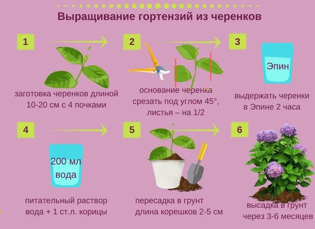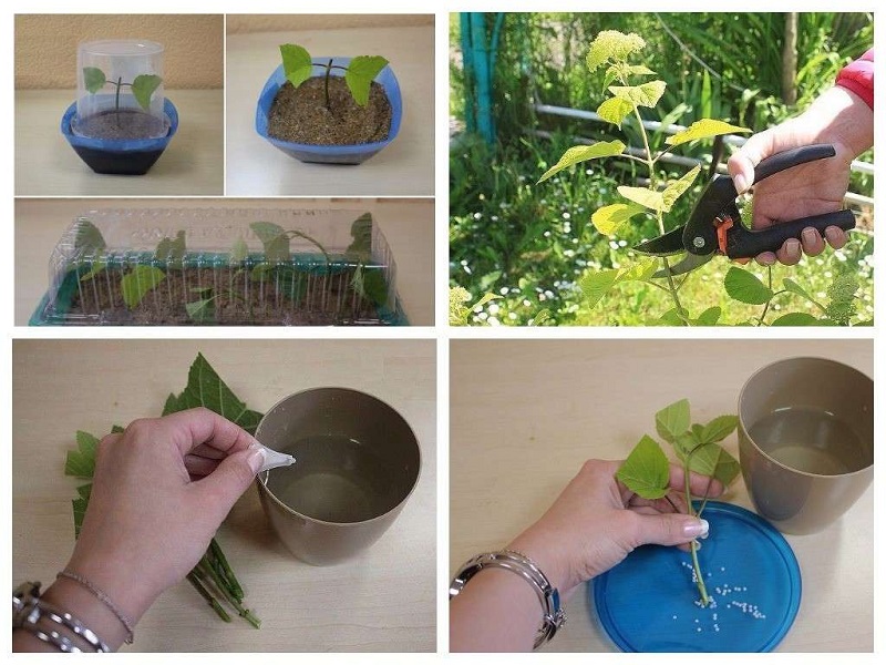 Reproduksjon utføres med lignifiserte stiklinger med grønne skudd for alle varianter av hortensia.
