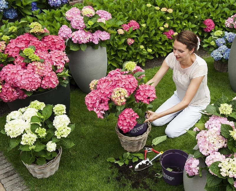 Deretter flyttes plantene med røtter i potter med en diameter på 10 cm. Planten holdes innendørs ved romtemperatur og utenfor direkte sollys. I varmt vær plantes hortensiaer i hagen.