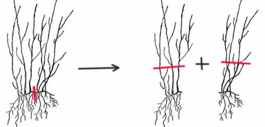 Til å begynne med blir busken gravd opp og delt i to. I den ene og den andre delen skal det være et vekstpunkt og en rot. En grop er klargjort for planting med en dybde på 30 cm. Jorda skal bestå av humus, sand og torv. De lander.