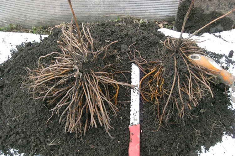 Det er mye vanskeligere å grave opp et eldre vintre. I denne situasjonen blir det laget en tunnel fra siden. Den eksponerte roten vaskes med vann. Deretter må du kutte ned en del av roten med en spade og dele den i flere frøplanter. Under planting forkortes små busker til to knopper.