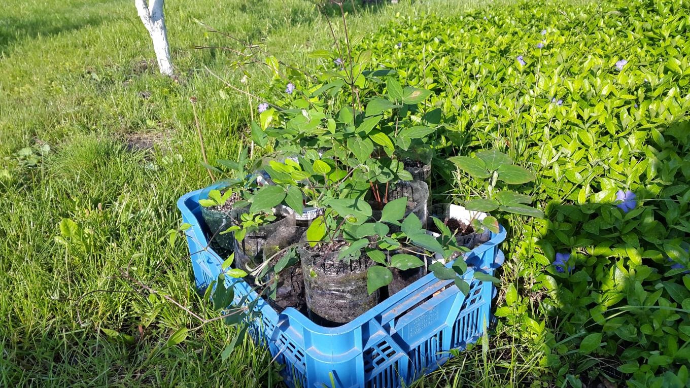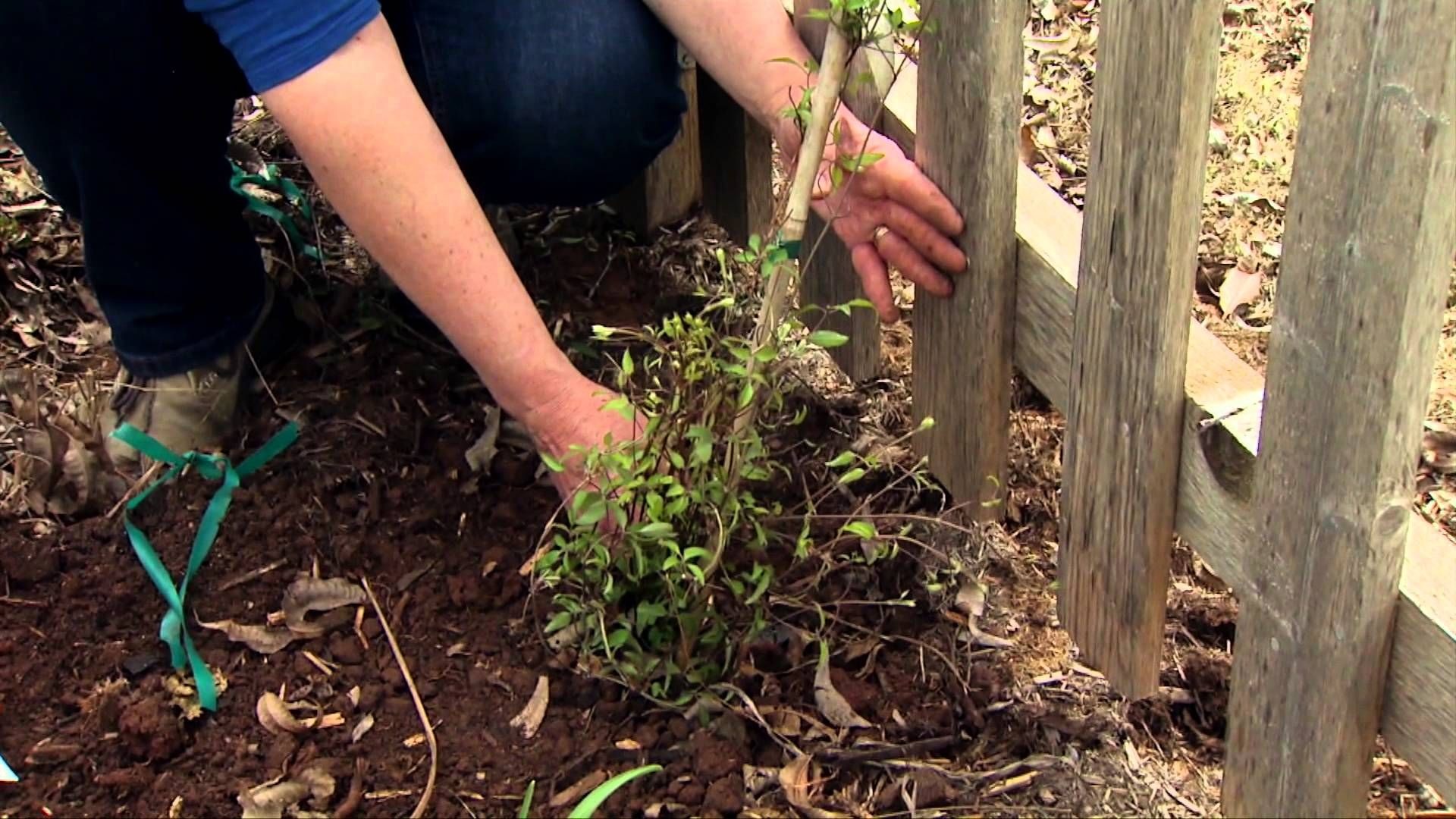 - Etter planting er busken godt vannet, en pinne plasseres ved siden av hullet som frøplanten er bundet til.