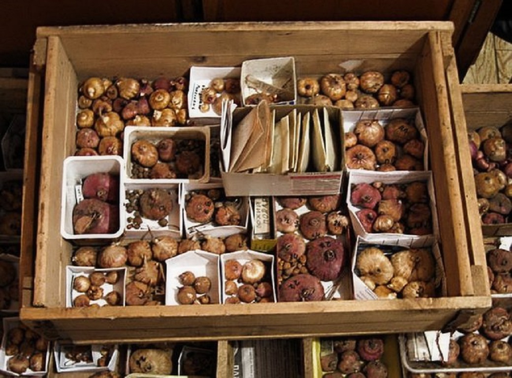 Krokuser for destillasjon plasseres i hyllene til en tørr kjeller eller kjeller, hvor temperaturen ikke stiger over + 10 .. + 15 ° C.Bruk samme container som for oppbevaring på balkongen. Hvis kjelleren besøkes av gnagere, blir plantematerialet brettet i ett lag i små glass-, metallkrukker og dekket med et lokk med smale hull.