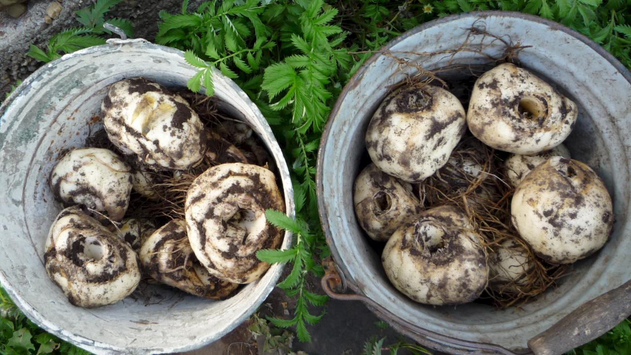 Du bør ikke nøle med å grave, spesielt hvis det regner eller det er en skarp kontrast mellom natt- og dagtemperaturen. Under slike værforhold er pærene som er sovende i jorden mest sårbare. Råtner utvikler seg raskt på vekten. Fristen for å trekke ut blomsterhoder fra bakken er midten av august.