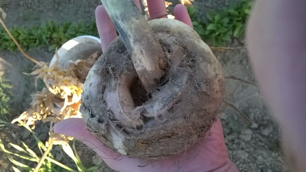 - etter å ha løsnet jorden, fjernes pæren av den nedre delen av stammen;
