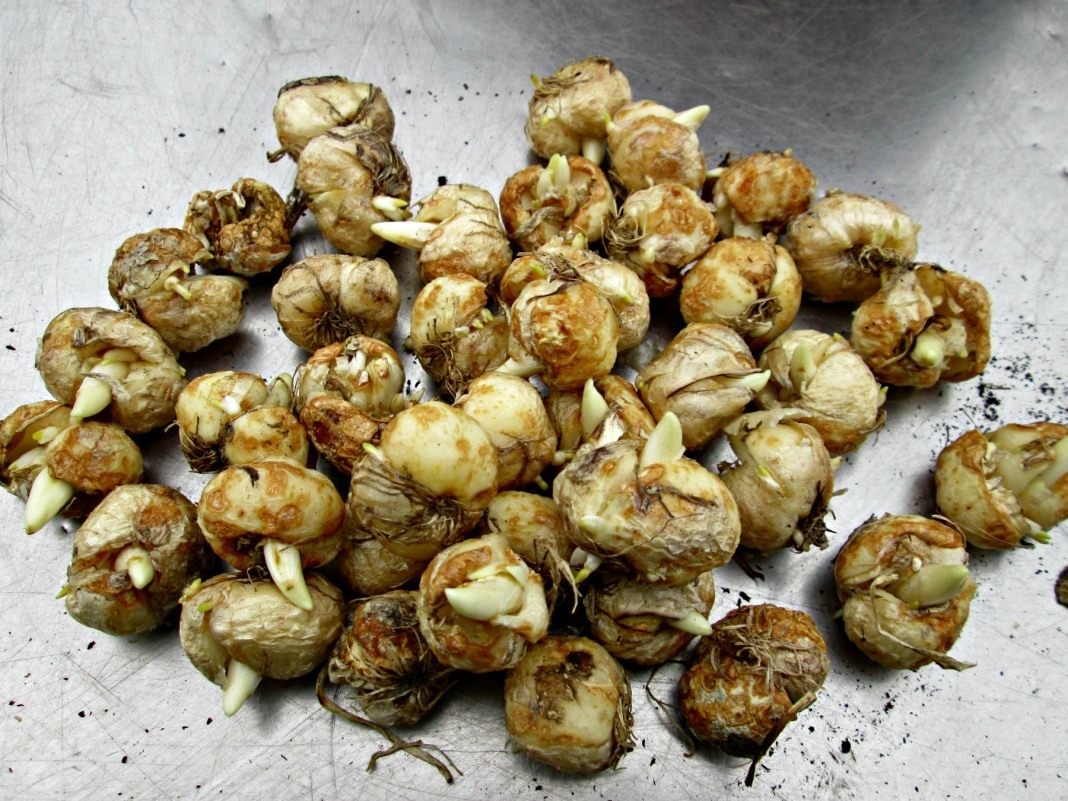 Ved slutten av lagringen er en spire synlig fra hvert hode, opptil fire skudd vokser fra store pærer. Røttene strekker seg raskt bare i høy luftfuktighet.