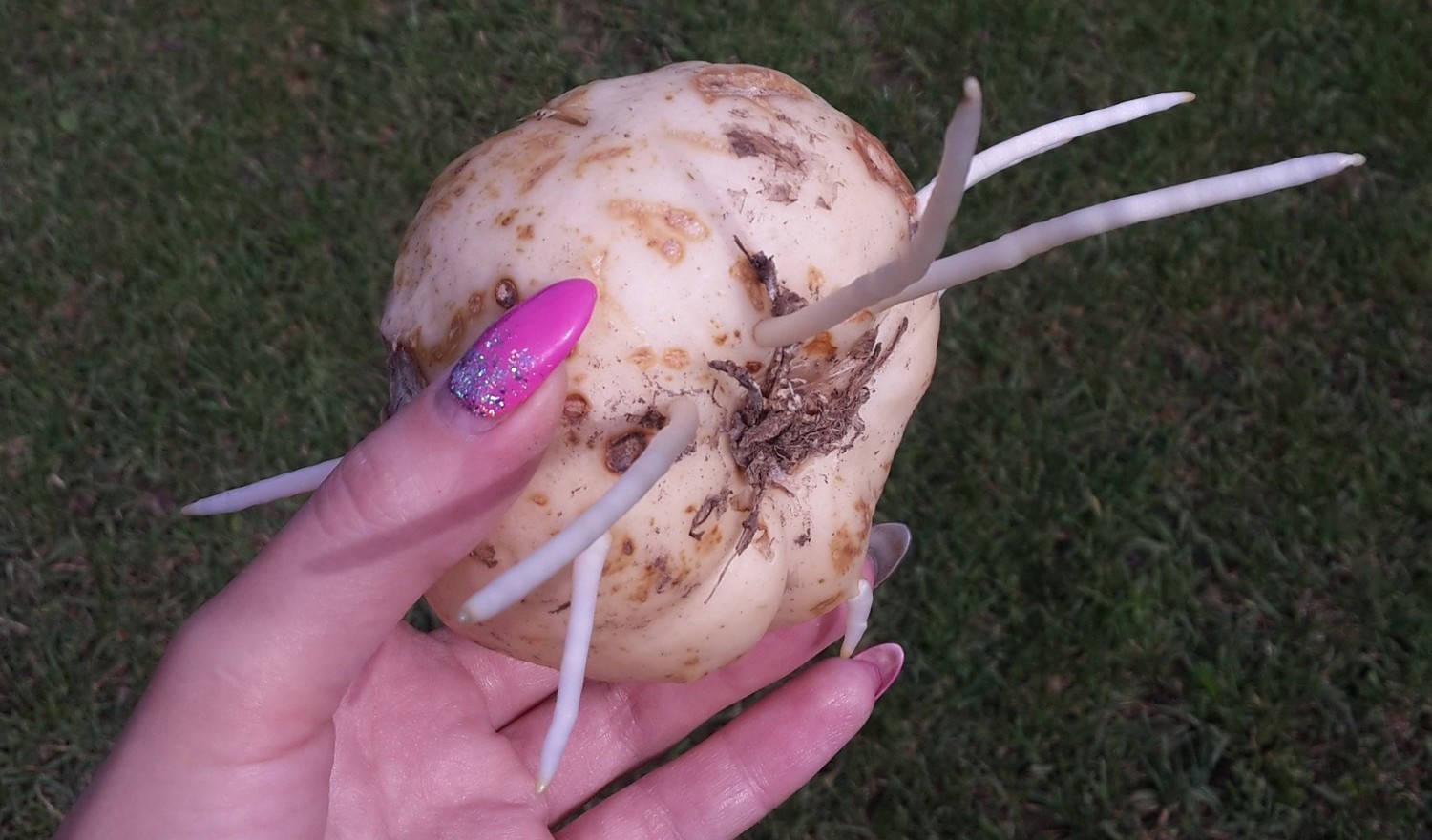 - forresten, store hoder med en diameter på mer enn 8 mm er kuttet i 4 deler, slik at det på hver skive er et stykke av bunnen, hvorfra røttene spirer;