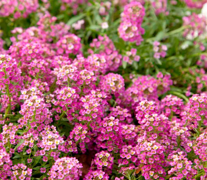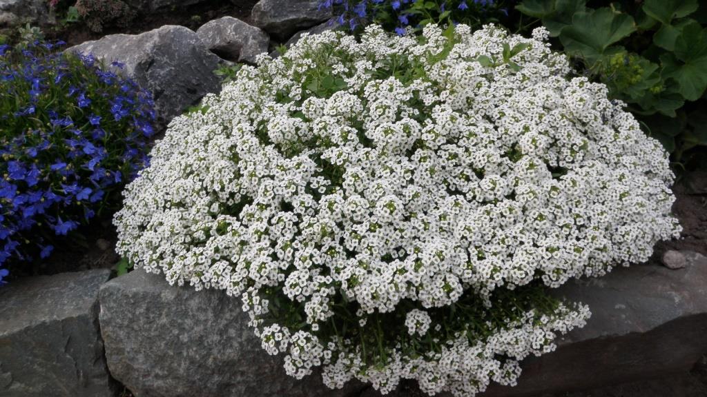 Alyssum årlige blomstrer vakkert og kan perfekt utfylle andre blomster i blomsterbedet. Den begynner å blomstre i juni og varer til sen høst. Nyanser er hvite, rosa og lilla.