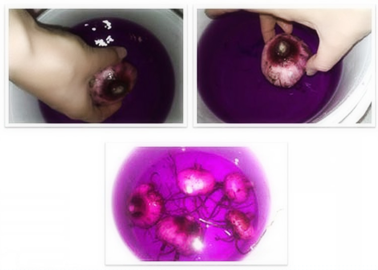 Det tar 10 liter vann, 1 g kaliumpermanganat, 20 g saltpeter og 10 g borsyre. Fortynn separat 20 g kobbersulfat i 1 liter vann. Rør løsningene. Hell knollene i en halv time før plantingen.