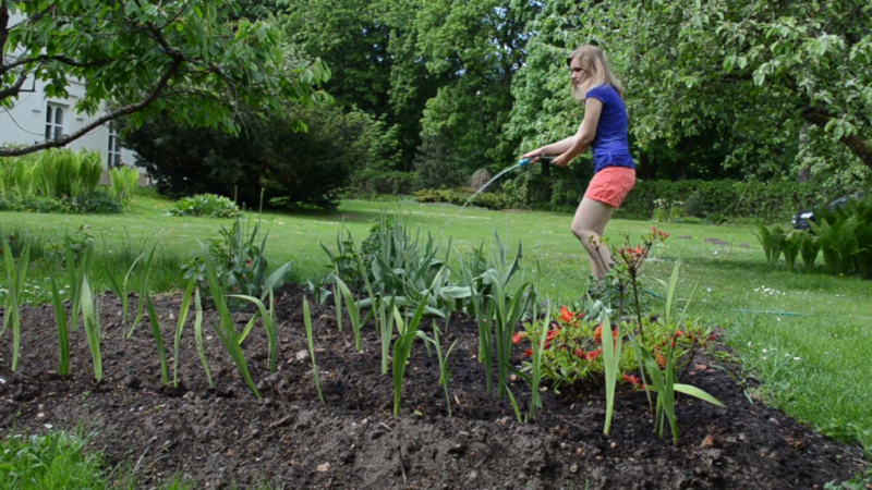 - En liter krukke med mullein tilsettes 10 liter vann, og blomsterhagen blir vannet mellom radene.