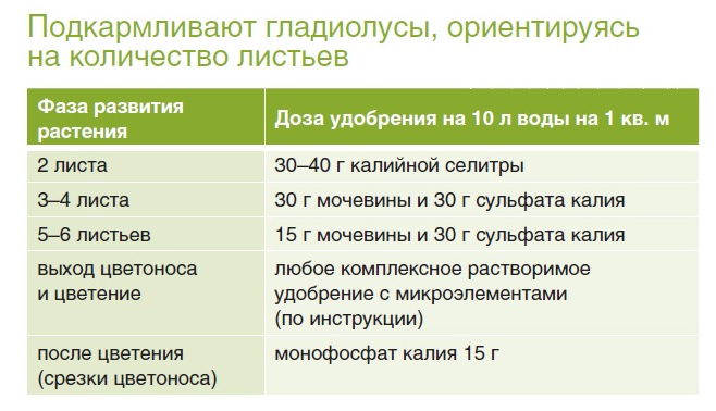 Fôring av ung gladioli med fosforholdige forbindelser utføres om våren når 5 eller 6 ekte blader dukker opp. Påfylling av fosfor i spirende fase er spesielt verdsatt, elementet konsumeres aktivt som forberedelse for dannelsen av blomster.