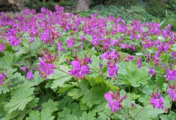 For å skape en vakker kant rundt et blomsterbed eller en hagesti, vil nydelig geranium gjøre. For å skape attraktive flekkete flekker på hageplenen, er det bedre å bruke en litenblomstret hage geranium, den vil se ut som en ballerina. Blodrøde pelargoner vil se vakre ut i utkanten av buskplantninger. Dette utseendet vil se organisk ut i frukthagen.