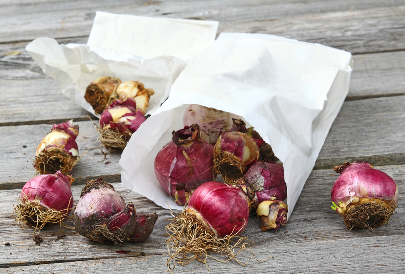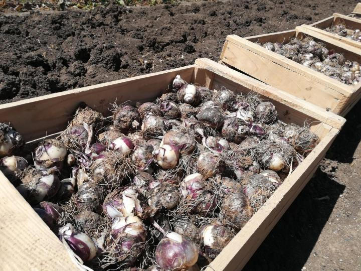 Bladene fjernes, bakken rengjøres, på et tørt sted i et trekk i skyggen av pæren, de tørkes i en uke ved 20-22 ° C. Etter det blir de frigjort fra røtter, skalaer og store "barn" skilles fra hverandre.