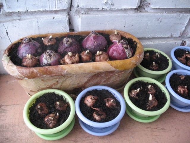 Du kan ta kjøpt universell jord med vermicompost og fosfatgjødsel. Pærene blir plantet og etterlater en tredjedel av dem over overflaten. Beholderen overføres til et kjølig, mørkt sted med en temperatur på 5-7 ° C, der hyacinter spiser. De blir regelmessig matet og vannet.