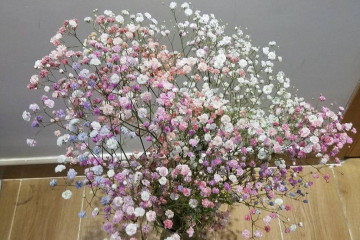 De mest populære varianter av gypsophila endrer ikke nyanser av blomsterstandene etter tørking. Om nødvendig kan de farges med naturlige fargestoffer. Like velfargede gypsophila-grener ser like bra ut i flerblomstrede og monokrome sammensetninger.