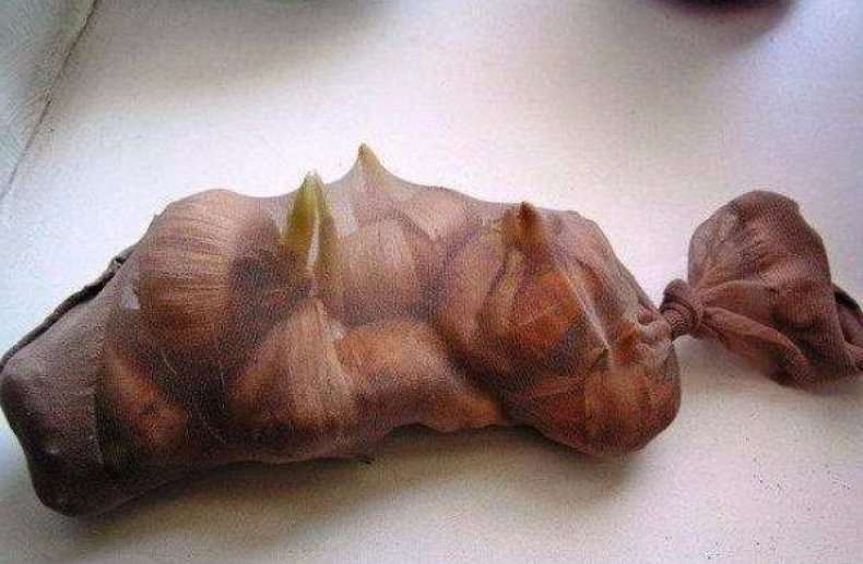 Hvis hjemmet ditt har et kjølig, mørkt rom, er det praktisk å oppbevare pærene i syntetiske strømper. Så de vil få tilgang til friluft. Strømper fylt med knoller bindes og festes til veggen.