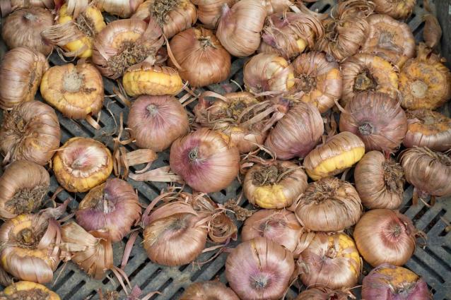 - Knollene plasseres i 7-12 dager på et godt ventilert sted ved en temperatur på 23-28 ° C. De blir snudd 2 ganger daglig for å tørke jevnt. Dette er en veldig viktig prosess som påvirker plantehelse og spiring av pærer. Syke og ødelagte prøver kastes og brennes straks;