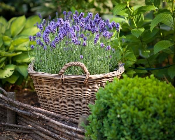 - Hengende potter og potter er et alternativ til vanlige blomsterpotter som gjør at lavendelbusker kan løftes opp;