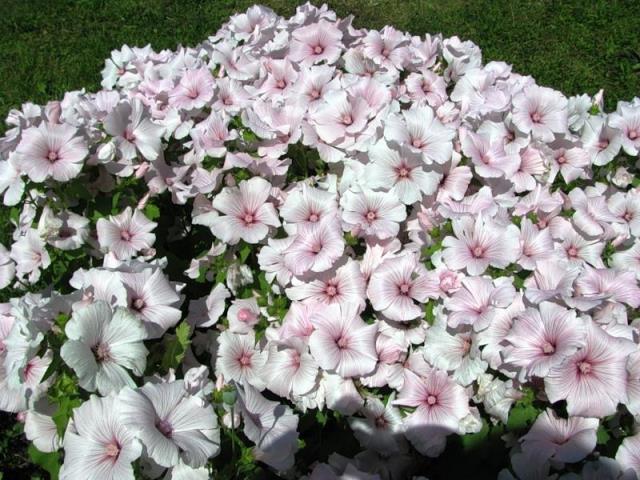 Lavatera flerårig - hvite og rosa blomster i hagen