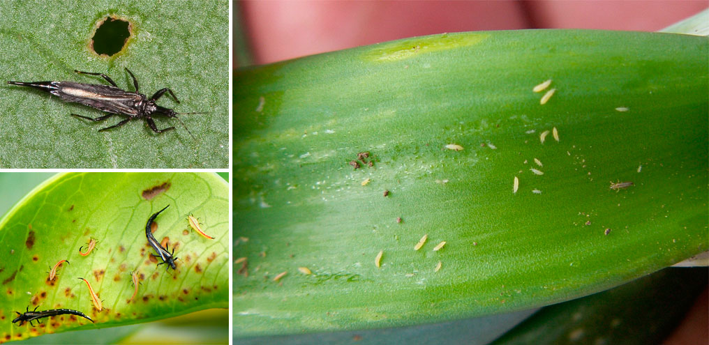 - thrips er små insektsugende skadedyr som finnes på innsiden av bladene;