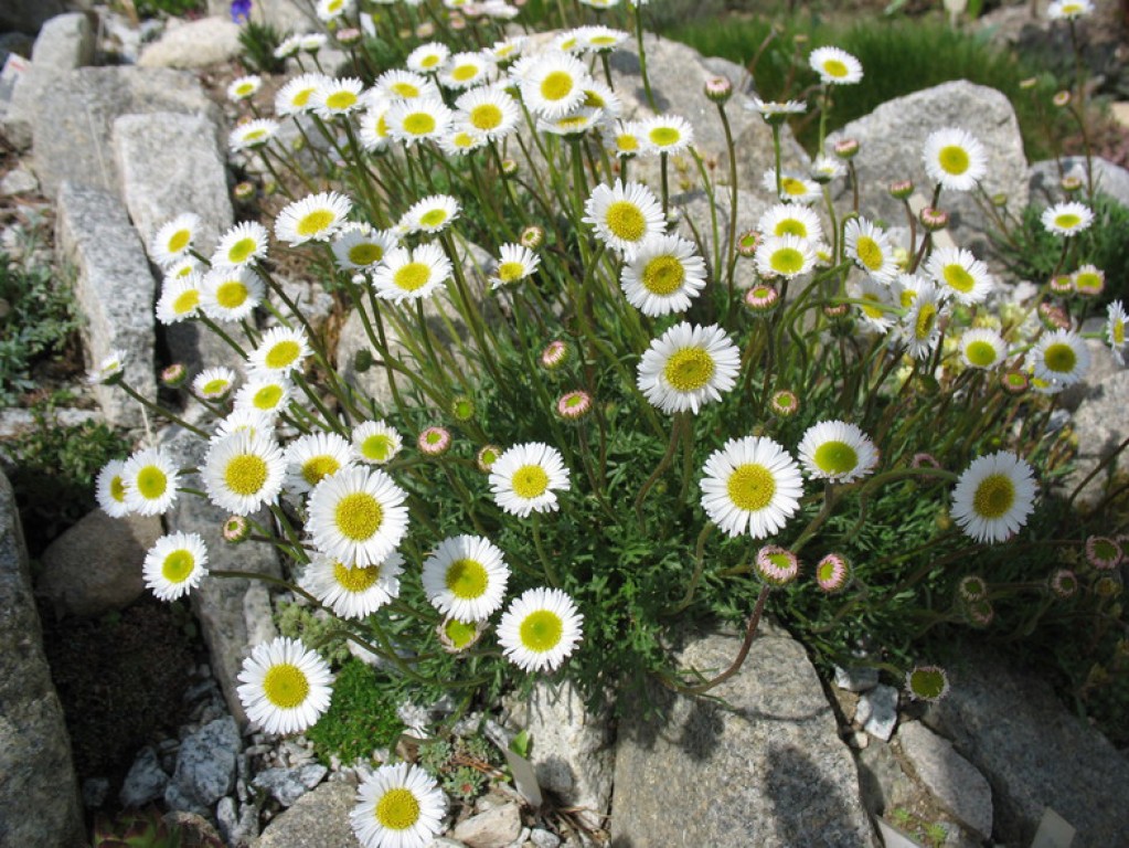 Den lille kronbladen Karvinsky (erigeron karvinskianus) er egnet for dyrking i blomsterbed og overliggende strukturer - høyden er bare 15 cm. Hvis du lar den vokse i åpen bakke, vil den ta opptil en halv meter i diameter.