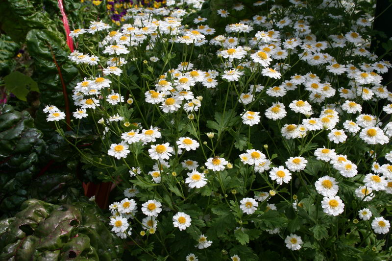 - Zilbeoteppich, preget av snøhvit blomsterstand, som pyretrum Carlos;