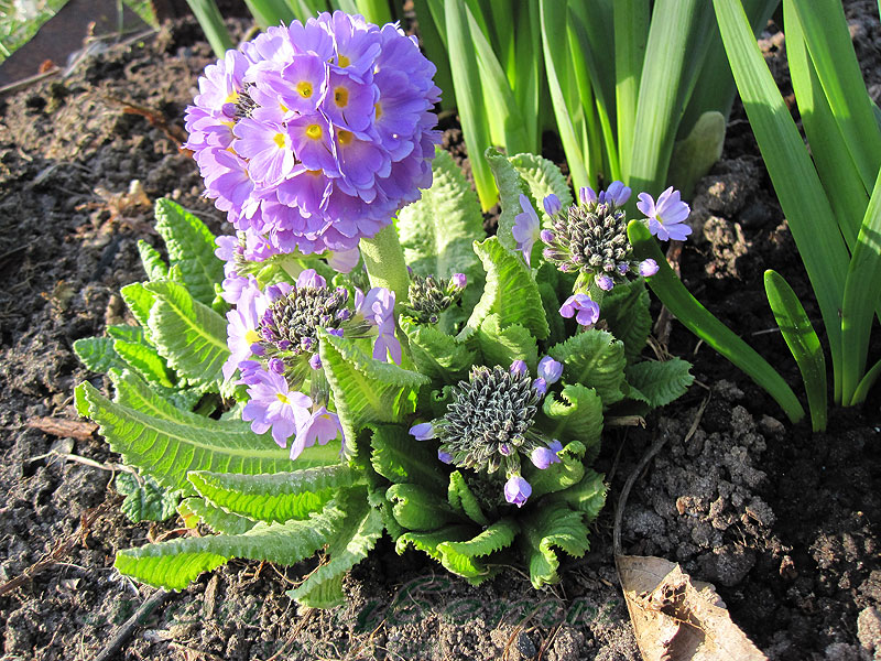 Den urteaktige flerårige primula blomstrer umiddelbart etter at snødekket forsvinner (midten av april). Pedunkelen utvikler seg raskt, i tråd med de nye grønne bladene. I begynnelsen av blomstringen når høyden 2-3 cm, i løpet av perioden med aktiv blomstring - 20-25 cm. Når fruktene modnes, når høyden på peduncle 30-50 cm. Blomster samlet i store sfæriske blomsterstander har forskjellige farger.