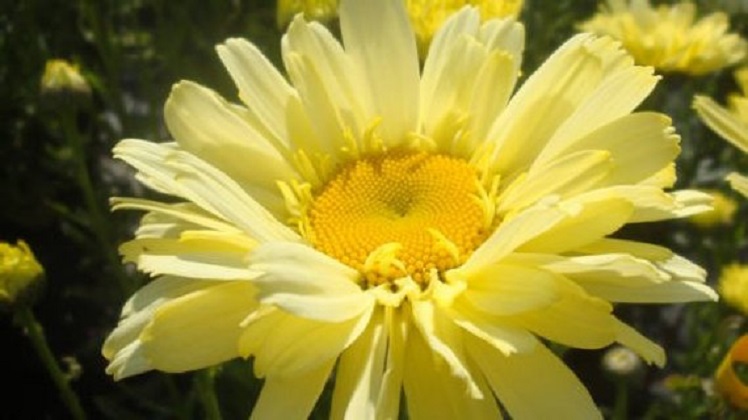 Mange blomsterhandlere planter flerårige kantblomster - Banankrem kamille. Deres viktigste fordel og forskjell fra andre representanter for Astrovs er deres uvanlige farge. Fra knoppene blomstrer først luftige gule blomsterstander, som til slutt lyser opp og får en elfenbenfarge. Det lyse gule hjertet understreker bare den edle fargen på kamille.