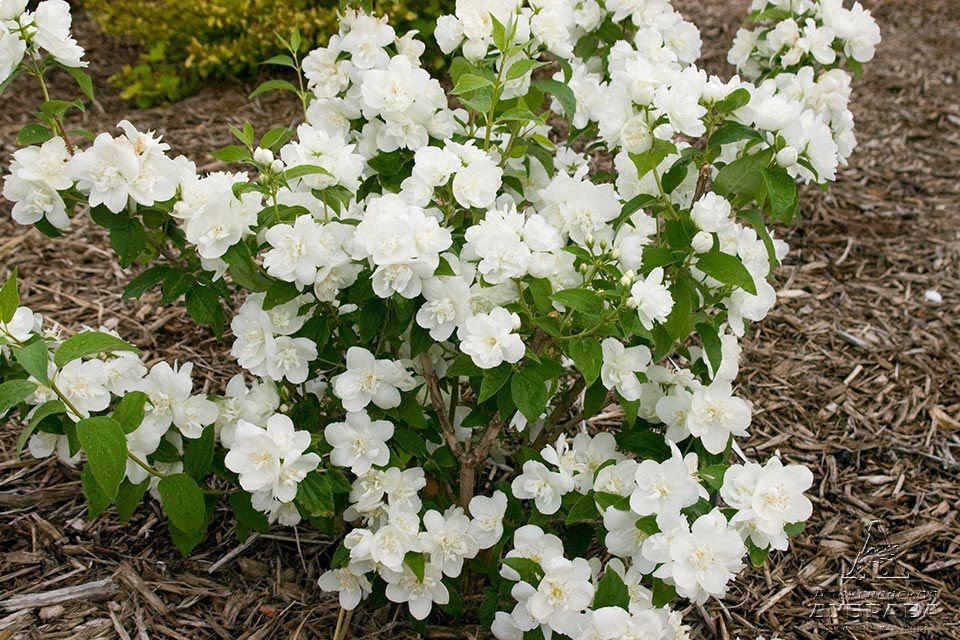 | Mont Blanc | Busken når knapt en meter i høyden. Små (opptil 3 cm) snøhvite semi-doble blomster samles i 3-5 stykker. inn i grasiøse blomsterstander. Kronbladene, som ligger midt på blomsten, er pakket innover. De ytre er brede, elegant bøyd bak, og danner en tett rad uten hull. | Blomstrer i midten av juni og duftende i 1-1,5 måneder. |