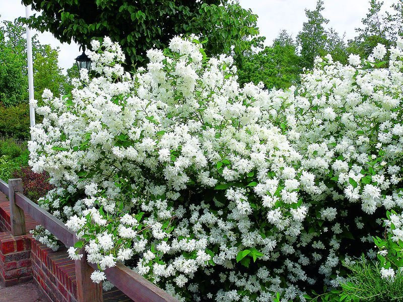 | Storblomstret | Chubushnik vokser opp til 4 m.Snøhvit farge danner seg på sidegrenene i form av vakre store børster |