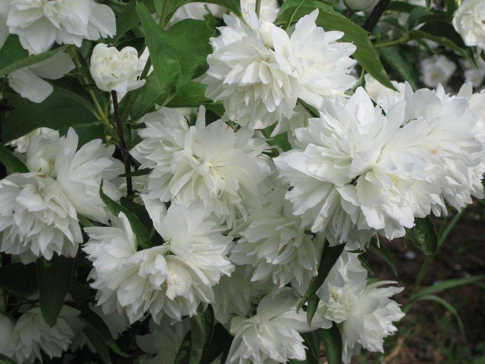 | Koronar | Planten når en høyde på 3 m, men det er også dvergformer for hagen. Produserer racemose duftende blomsterstander. Kremhvite blomster når 3,5 cm i diameter. Det er også dobbel jasmin med store blomster |