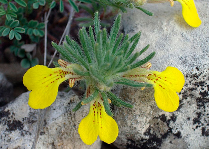 Den vokser bare opptil 6 cm. Bladene har en grønngrå fargetone og takkede ender. De ser ut som støt. Blomstene er gule.