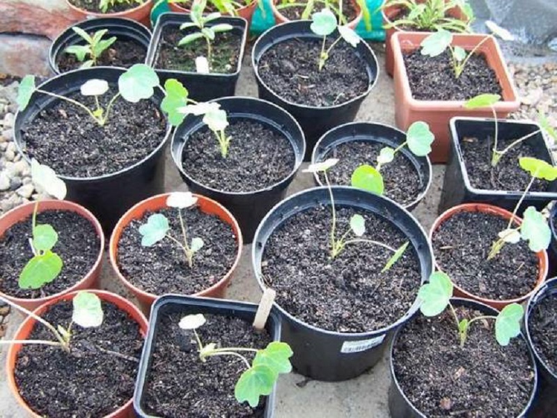 Biocontainere, potter laget av torv, plast, kopper med avtagbar bunn opptil 10 cm i diameter er egnet som beholdere for bygging av nasturtiumplanter. Den beste løsningen er å ta torvtabletter for dette formålet.