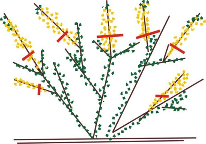 Når du adler en busk, fjernes grener som er lave over bakken eller de som berører den. Tilsvarende blir skudd som vokser innover eller kommer i kontakt med andre skudd ødelagt.