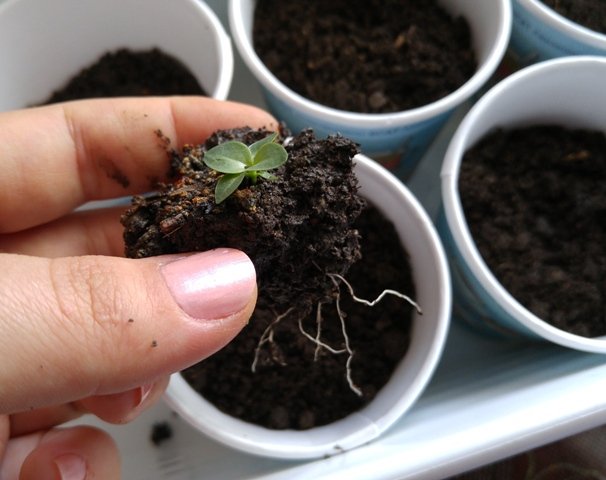 Ved dårlig utvikling anbefales det å stikke granulatene med en tynn nål før plantingen. Huset fjernes ikke umiddelbart, plantene blir gradvis åpnet for å tilpasse seg miljøets ytre innflytelse. Transplantasjon av spirer utføres i gjennomsnitt 3-5 stk. i en container etter 1,5-2 måneder, er høyden minst 10 cm.