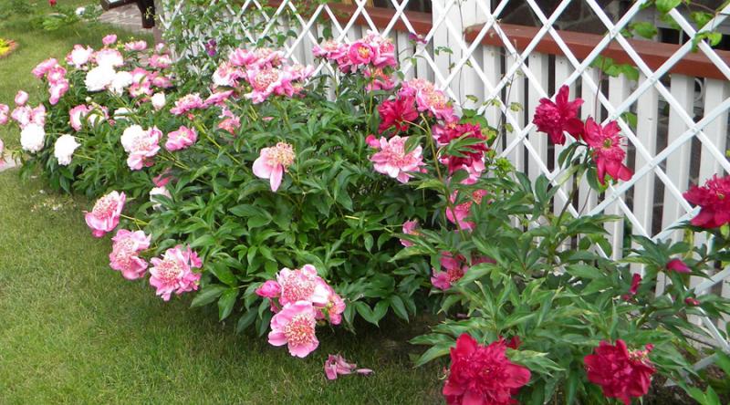 For et flatt område kan du velge langstrakte blomsterbed, for eksempel en kantstein eller en sammensetning som kalles rabatka. De vil tjene som dekor for et gjerde eller annen struktur. I dette tilfellet må variantene ha lik høyde og forskjellige nyanser. En utmerket løsning ville være å lage en mixborder med pioner.