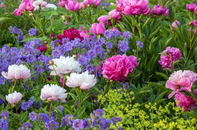 Et blomsterbed med pioner - en kombinasjon av planter i en blomsterhage