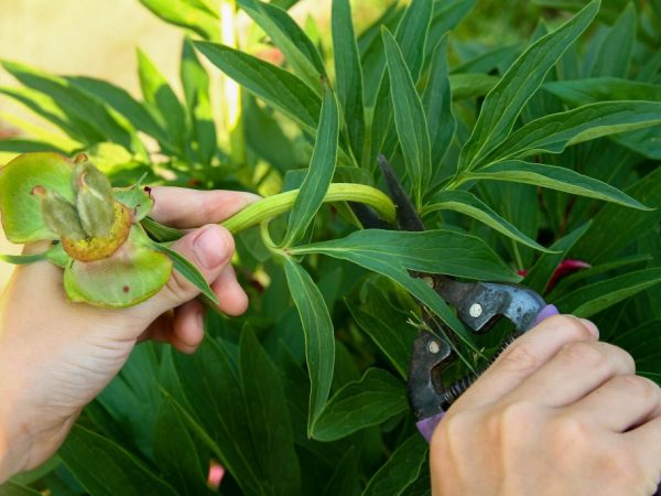 Før knoppene vises, skal pioner behandles med kobberoksyklorid. Det hjelper å unngå utvikling av sopp.Hvis du planlegger å kutte blomstene i knopper, anbefales det å legge igjen minst 2 kronblader på grenen.