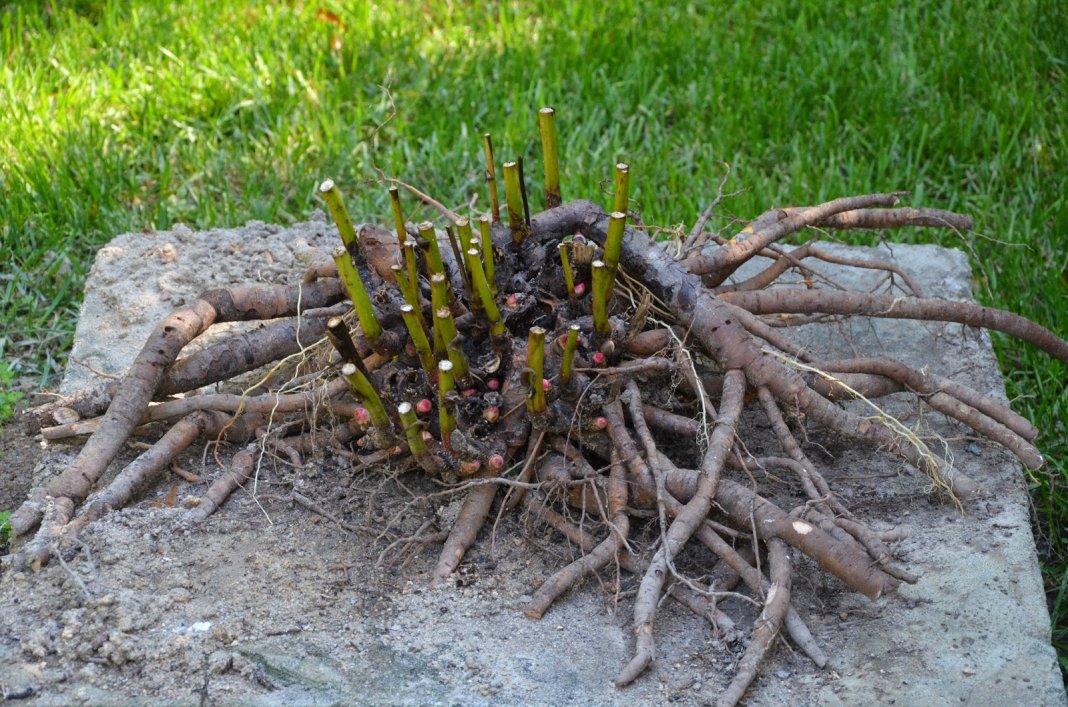 - Grav ut en busk med en høygaffel, og fjern røttene forsiktig fra den underjordiske delen.