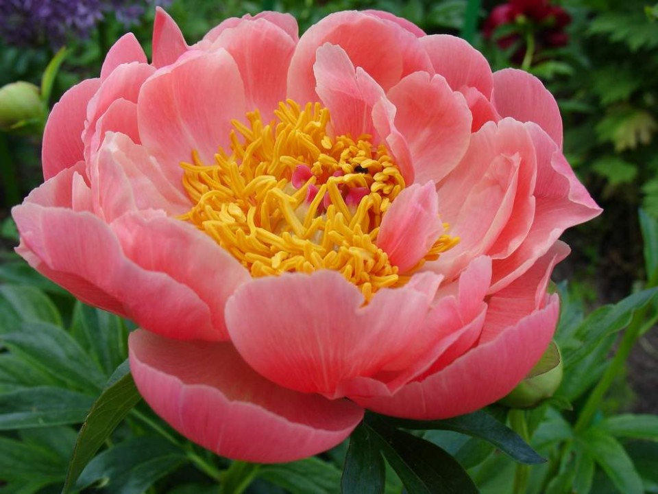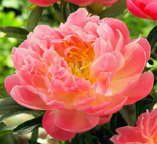 Peony Pink Hawaiian Coral (Paeonia Pink Hawaiian Coral) - Amerikansk semi-dobbel hybrid fra den såkalte korallserien. Korall, fersken, aprikos, melon nyanser av de ytre store kronbladene av den åpne blomsten kompletteres med de indre små kremete kronbladene og gule stammer. En av de første "koraller" -varianter med et navn som minner om korallene på Hawaii-øyene.