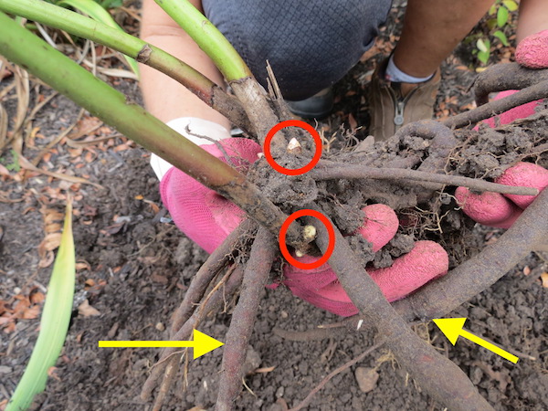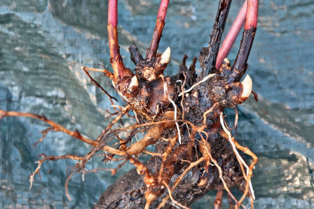 Delenka undersøkes, ødelagte og råtne røtter fjernes, kuttene og de avbrutte delene av roten drysses med aske, kull, et middel for å stimulere vekst. Det er bedre å kutte de største røttene med 1/3 av lengden.