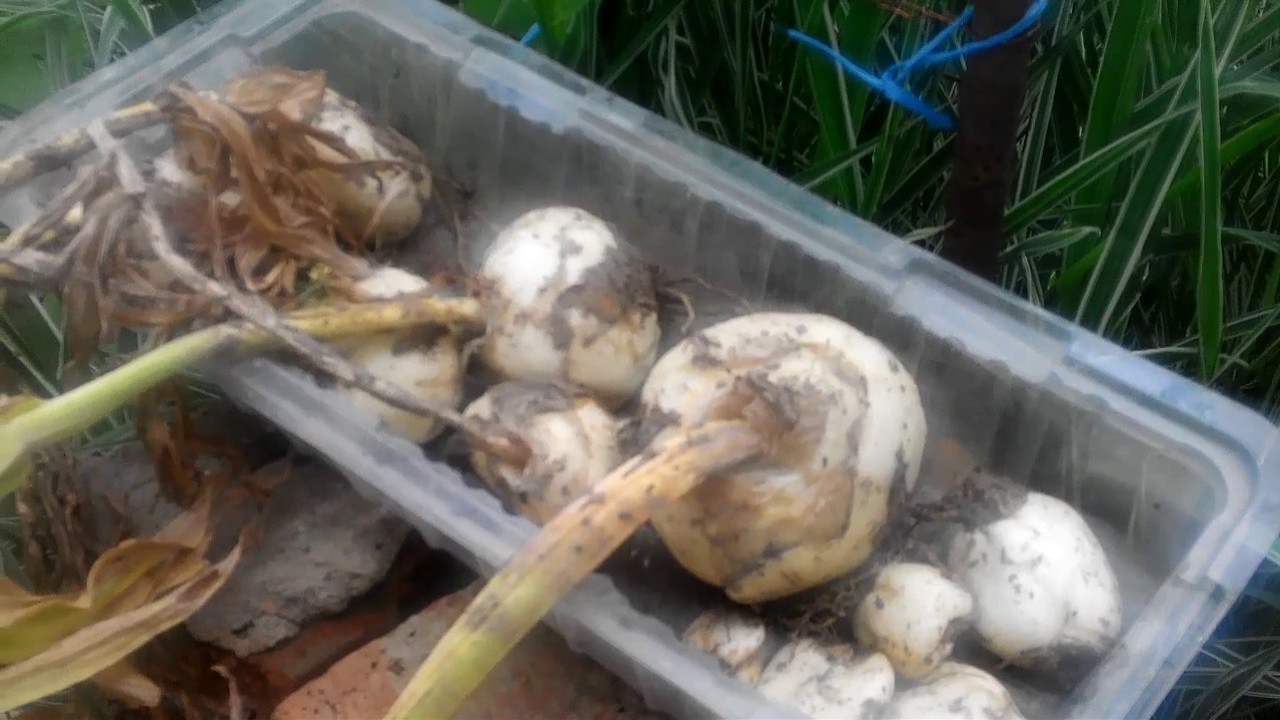 Planten trenger pleie ikke bare under planting, men også etter. Når planten blekner og mister sin dekorative effekt, begynner bladene å bli gule og dø av, så er det nødvendig å grave ut pærene. De skrelles av, vaskes med varmt vann. Deretter holdes løken i en svak løsning av kaliumpermanganat. Rotflekker og andre skader fjernes. Skjæringsstedet behandles med et soppdrepende middel.