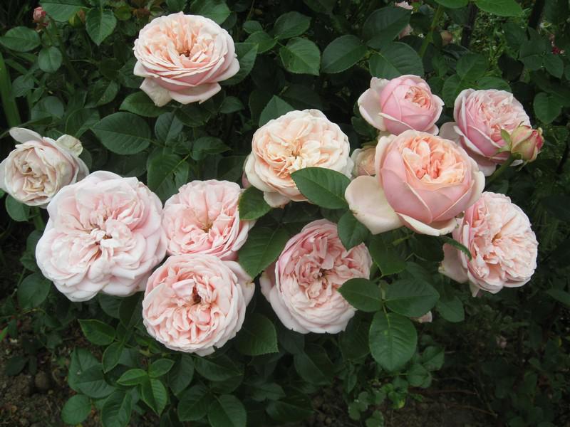 Et særegent trekk ved denne sorten er den samme høyden på stilkene, noe som gjør busken veldig ryddig og til og med litt streng. Store blader med rik mørkegrønn farge dekker nesten helt sterke skudd. Blomstene av denne skjønnheten er tett doble, vanlige koppformede, 10-12 cm i diameter. Antall kronblader med en tett struktur overstiger 40 stk. Fargen på rosen er delikat rosa med en ferskenundertone. Den ene stammen er kronet med en knopp.