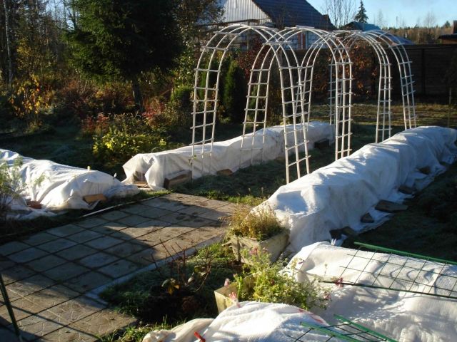 Antikke rosebusk som er dyrket i kalde områder, anbefales å dekkes til om vinteren. For å gjøre dette, må du legge vippene på et substrat av halm, dekket med et ikke-vevd materiale i 2 lag. Om våren fjernes lyet gradvis, slik at planten kan bli vant til det åpne sollyset.