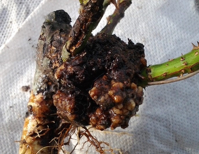 Under nedbrytning endrer oppbyggingen farge fra grå til brun. Mindre vanlig gjelder lesjonene den luftige delen av rosen, stilkene og grenene. Klumpete knuter og svulster dukker opp.
