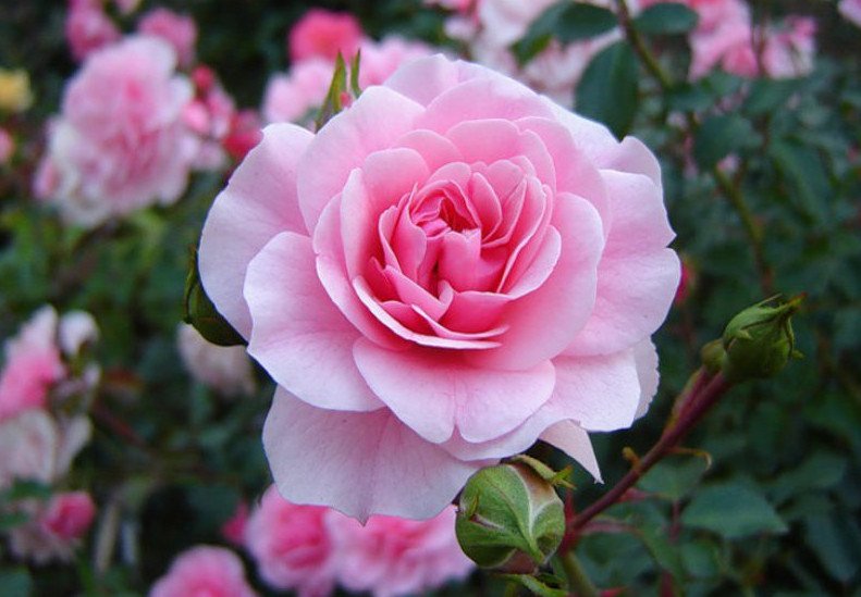 Bonika er kjent for sin luksuriøse blomst. Hvis det blir tatt vare på i samsvar med de nødvendige reglene, vil rosen glede publikum med vakre rosa blomsterstander.